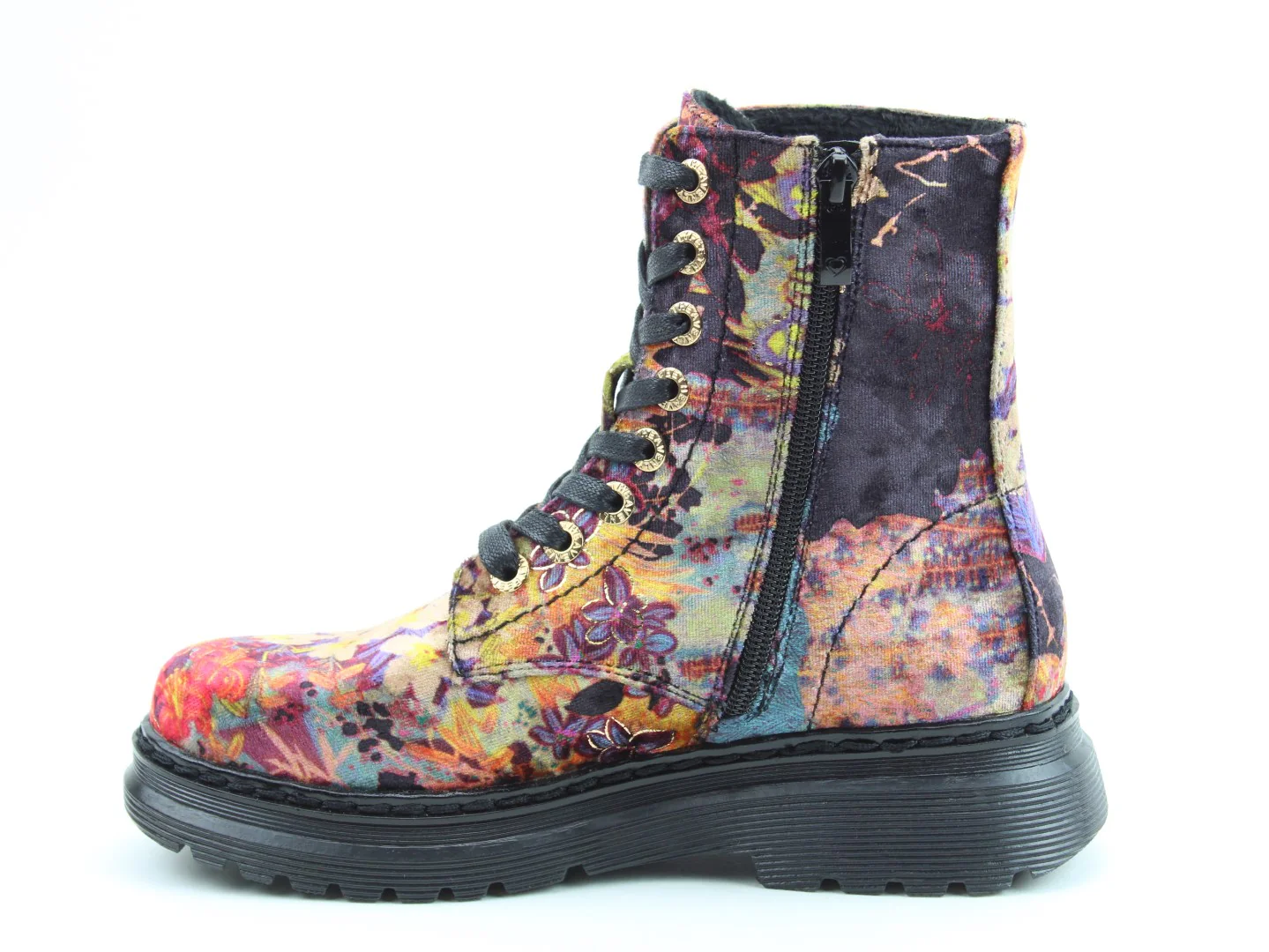 We are excited to introduce this new style to our range this season.  Vegan friendly, Lotte is a super stylish faux velour lace ankle boot.  The soft synthetic upper features a floral design print through a faux velour material with 8 eyelet lace and a full side zip for great fitting.  A soft textile lining is complimented by a fully removable memory foam insole offering supreme underfoot comfort.  A lightweight design with a hard wearing outsole this boot will be a must-have addition to your wardrobe and will suit a wide range of outfits whilst being perfect for all day wear.